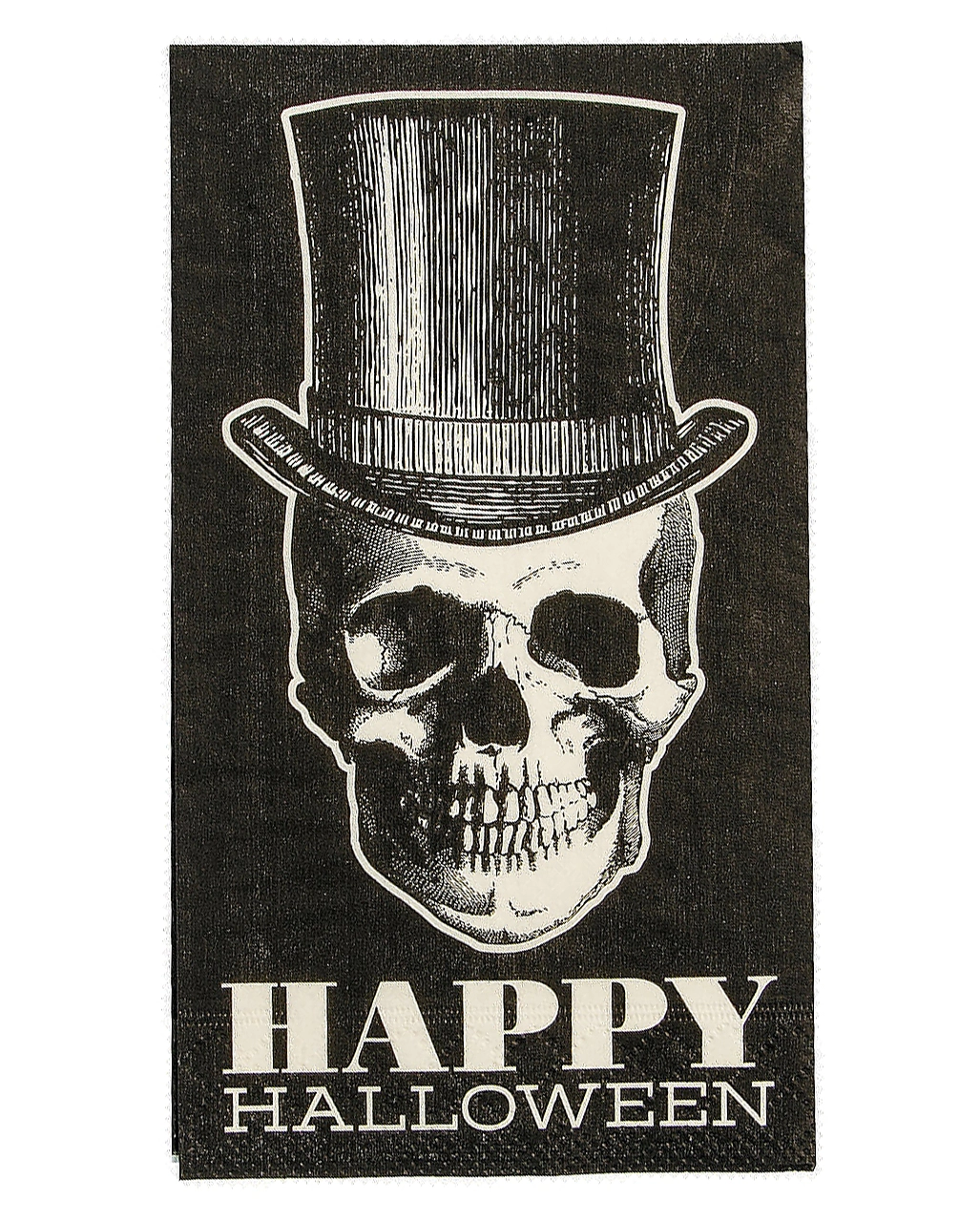 Du bekommst 16 Vintage Totenkopf Servietten mit den Maßen von ca. 11 x 20 cm. Die Halloween Papier Servietten mit Totenschädel Motiv sind in schwarz-beige Tönen gehalten und eine coole Halloween Tischdeko für deine Party. Das Motiv zeigt einen Totenschädel mit Zylinder und die Aufschrift “Happy Halloween”. Wer den Vintage-Style mag, wird diese Totenkopf Servietten lieben! In unserem Onlineshop findest du noch mehr coole Servietten für Halloween, wie die 50`s Fledermaus Cocktail Servietten 16 St.