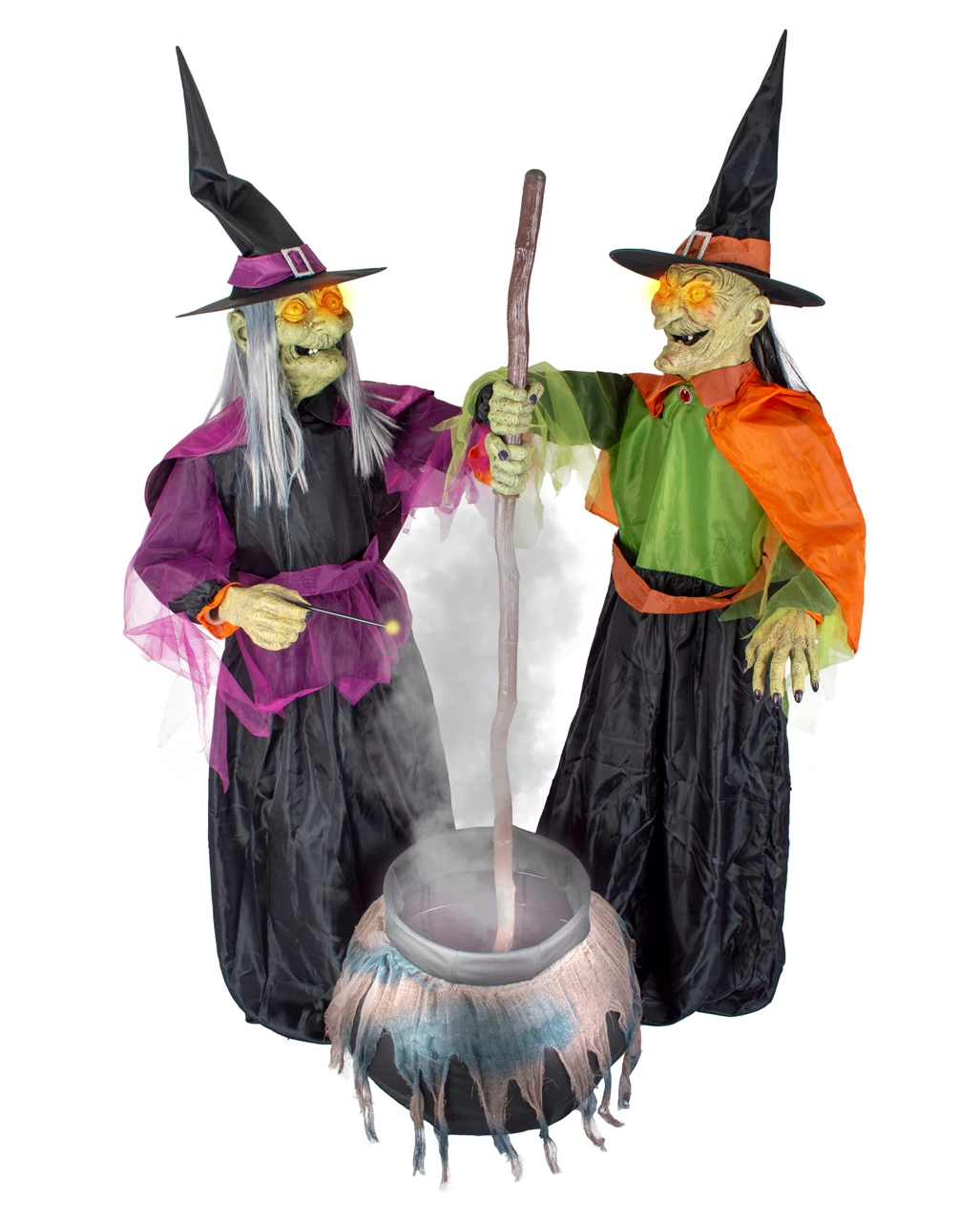 Die 2 Kochende Hexenschwestern mit Kessel sind das Highlight deiner Halloween Deko. Das fiesen Fratzengesichter, aus denen dir das Böse entgegenspringt, sorgen durch die leuchtenden Augen für Gänsehaut. Aber das ist noch nicht alles. Hinzu kommt der unheimliche Sound. Die beiden gruseligen Damen brauen etwas in ihrem Hexenkessel und tragen dabei stilechte Kleider und lange spitze Hexenhüte. Wer weiß, was sie da Schreckliches brauen. Dein eigenes Gebräu kannst du übrigens prima in dem Schwarzer Hexenkessel als Kunststoff Tasse servieren.