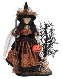 Hole dir jetzt die beleuchtete Geisterhexe aus dem Märchenwald, mit einem Hexenbesen und einem Kürbis-Eimerchen in der Hand. Man weiß nicht genau, ob dies auf der Suche nach Süßwaren für ihr Hexenhaus ist, oder doch schon nach Hänsel und Gretel Ausschau hält, um diese in ihr Knusperhäuschen zu locken? Die zwei Skelett-Figuren, die vor einem schwarzem Bäumchen sitzen, lassen nichts Gutes erahnen! Unsere beleuchtete Märchenhexe aus dem Geisterwald ist ein Muss für Liebhaber von Halloween und Walpurgisnacht, und hebt sich absolut von billiger Massenware aus Fernost ab. Dekoriere mit der exklusiven Halloween-Deko, die an feinstes Kunsthandwerk erinnert, dein spooktakuläres Zuhause.