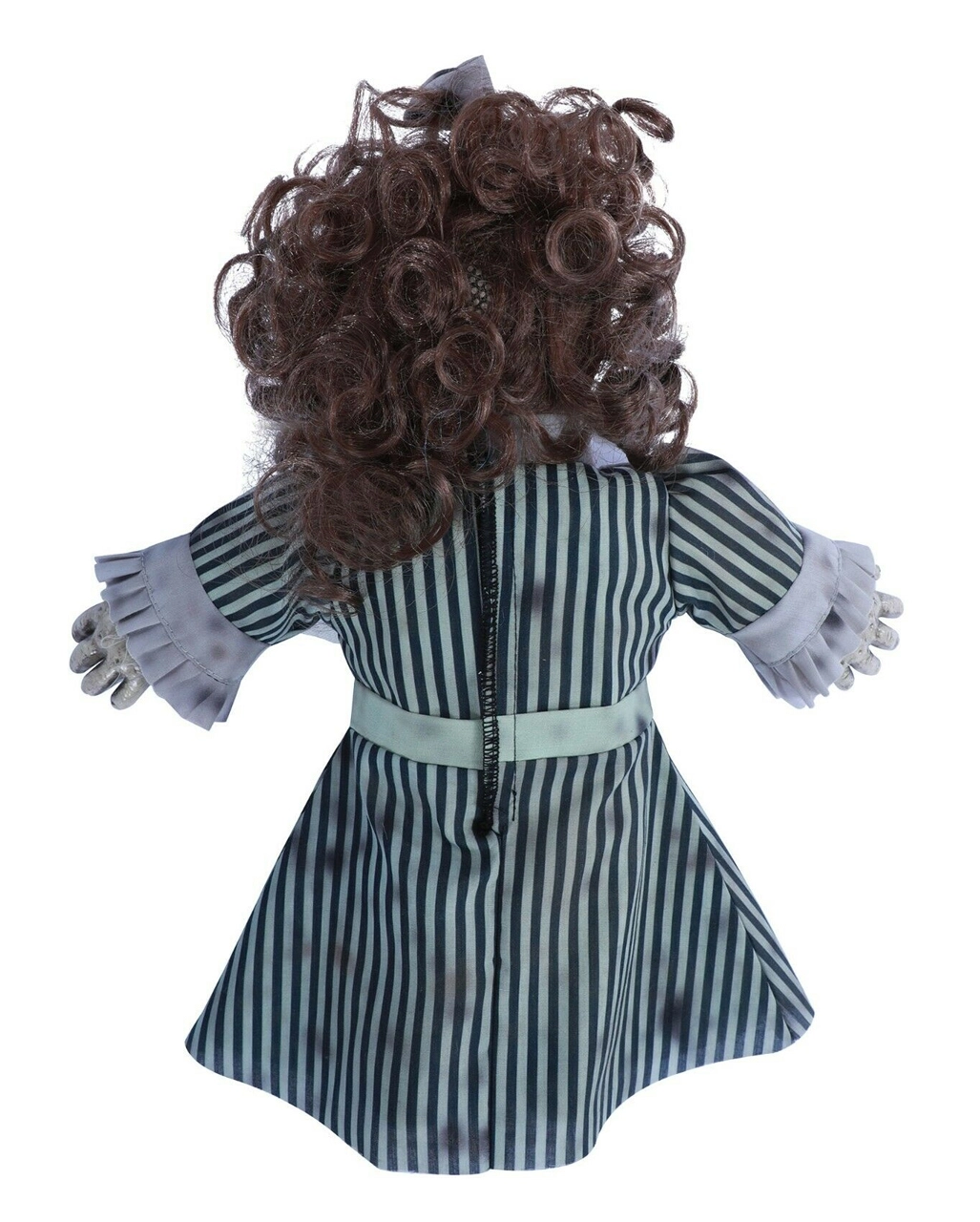 Unsere Besessene Geisterpuppe Betty mit Sound ist schließlich eine Halloween Animatronics, die ganz schön unheimlich ist. Die Grusel Puppe trägt ein zauberhaftes Vintage Kleid mit grünen und weißen Streifen. Wenn du die passenden Batterien einlegst, dann kannst du die Grusel Puppe als Halloween Dekoration auslegen oder setzen.