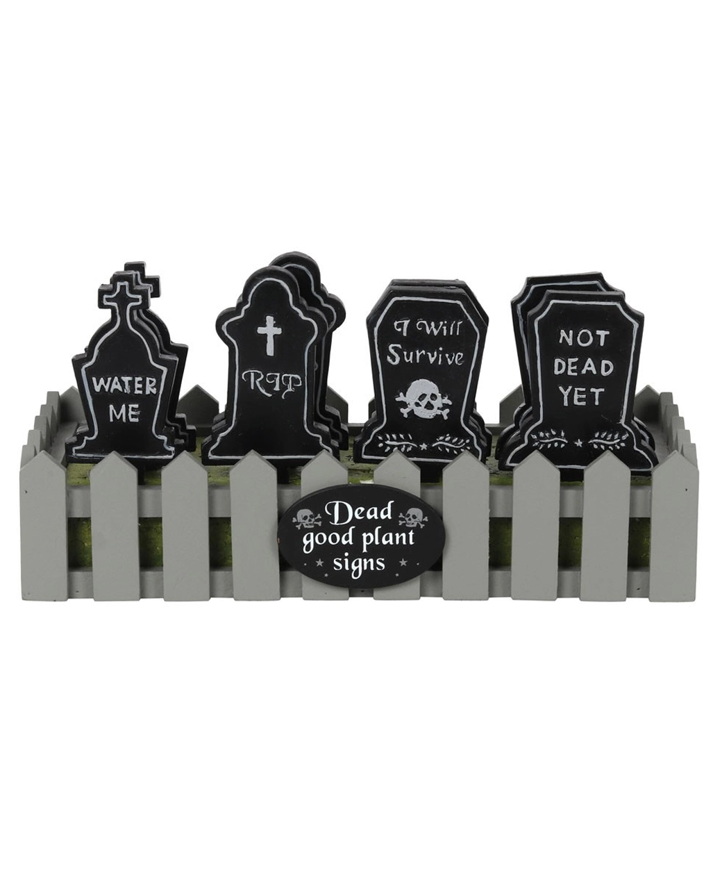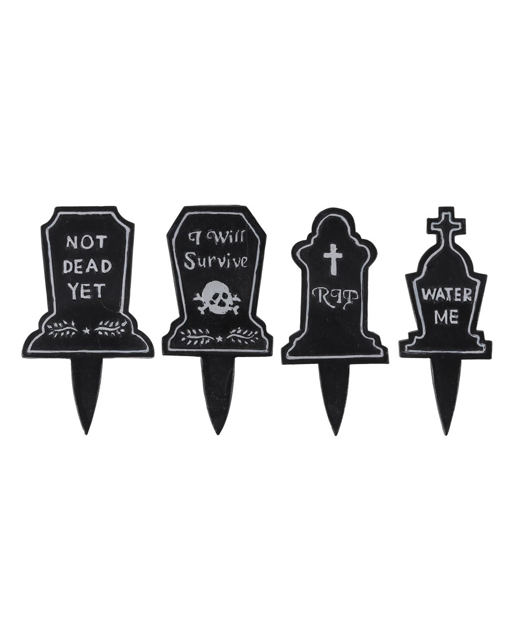 Wenn deine Zimmerpflanzen den Kopf hängen lassen und traurig vor sich hinwelken, brauchst du unbedingt dieses Pflanzenfriedhof Grabstein Schild. Es zeigt auf ironische Art, dass man dir besser keine Pflanzen anvertraut. Das witzige Pflanzenschild im Grabstein Design zeigt eine von vier möglichen Aufschriften: “Water Me”, “RIP”, “I will Survive” oder “Not Dead Yet”. Stecke die Grabsteine in den Blumenkübel zu deiner Lieblingspflanze, und erinnere dich stets daran, sie gut zu behandeln und regelmäßig zu gießen. Die Grabsteine für Zimmerpflanzen sind ein cooles Gothic Wohnaccessoire und eine super Deko-Idee für die Halloween Zeit.