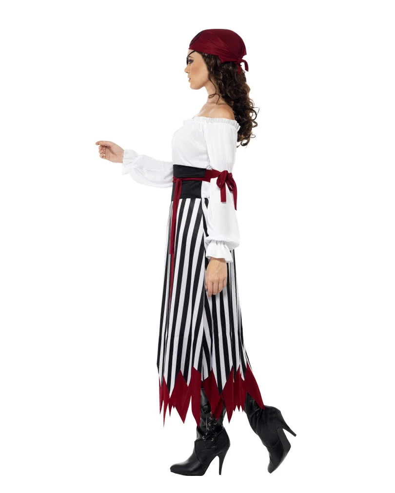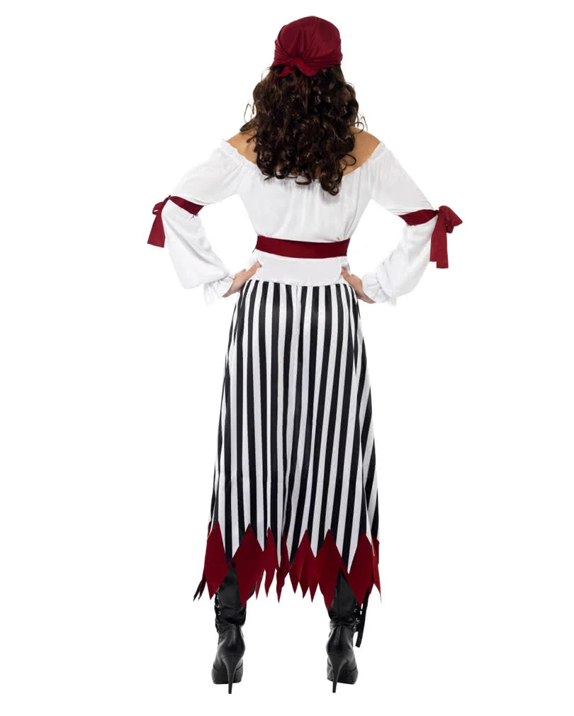Das schwarz-weiße Piratinnenkleid besitzt als Einteiler lange Ärmel und einen tiefen Ausschnitt, der mit Gummibund als Rüsche verziert ist. Das gestreifte Enden des Kleids sind am Knöchel mit roten Zacken abgesetzt und wird durch den schwarzen Stoff an der Taille zur Bluse hin raffiniert unterteilt. Der angenähte rote Gürtel sowie dazugehörige Armbänder sind das perfekte Kostümaccessoire und verleihen verspielte Rafinesse. Den Abschluss des Buccaneer Piratin Kostüms bildet das Kopftuch mit Totenkopfsymbol.