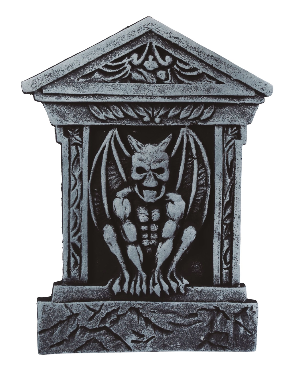 Du bekommst einen Grabstein mit Wasserspeier & Säulen. Er ist ca. 52 x 35 cm groß und besteht aus Kunststoff und Polystyrol. Als Requisite und Halloween Deko macht sich der geflügelte Gargoyle ganz hervorragend. Entdecke passend dazu unser Halloween Deko Moos 50 g sowie den Grabstein Todesruhe mit Moos 54 cm