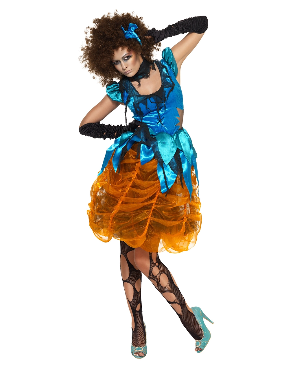 Die Killerella Verkleidung besteht aus einem Kleid und einem Halsband. Das ärmellose viktorianische Kleid besteht aus vielen verschiedenen Stoffsorten, die alle zerrissen und kaputt sind. Das Top ist aus glänzendem blauen und türkisen Stoff. Schwarze Stoffstücke umrahmen den Ausschnitt. Dreieckige blau-türkise Stoff-Fetzen hängen auch von der Hüfte hinab über den Rock, auch der schwarze Stoff hängt in Fetzen herab. An der linken Seite hat das Top ein Loch, das mit schwarzem Gaze hinterlegt ist. Der orangene Tüll-Stoff des Rocks ist auf viktorianische Art gerafft. Der Rock geht ganz un-viktorianisch bis zu den Knien. Das Halsband ist aus asymetrisch geschnittenem schwarzen Stoff. Eine Grobnetz Strumpfhose schwarz, ein Paar türkise Riemchen Peeptoes Schleife und ein Paar Ellbogenlange Samthandschuhe schwarz machen Killerella fit für den Prinzenball.
