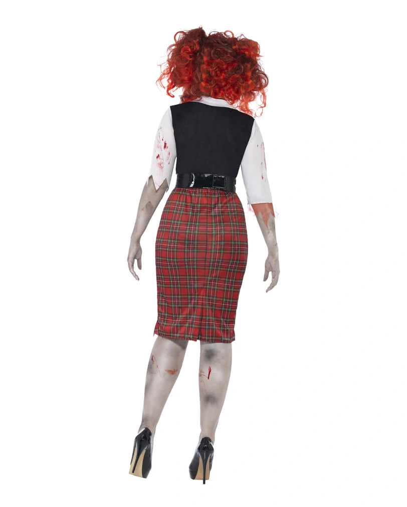 Das kurvige Schulmädchen Zombie Kostüm besteht aus den drei Teilen Kleid, Gürtel und Krawatte. Gedruckte Blutspritzer auf Bluse und Weste des Kleides zeugen von dem Kampf, den die Dame dem Zombie vor der Verwandlung lieferte. Diese Optik wird durch Risse an Kragen, linkem Ärmel und angenähtem Rock – angedeutet durch einen fransigen Schnitt – sowie durch hervorquellenden roten Tüll am rechten Ärmel unterstützt. Die Farbwahl – schlichte weiße Bluse, schwarze Weste, rot karierter Rock – entspricht dem klassischen Schulmädchen Outfit. Eine farblich zum Rockteil passende freche Krawatte lässt sich leicht per Klettverschluss am Hals befestigen. Vervollständigt wird das kurvige Schulmädchen Zombie Kostüm mit einem breiten schwarzen Lackleder Gürtel. Die Schnalle dient lediglich zur Zierde, auch der Gürtel lässt sich mit einem Klettverschluss fixieren. Geschickt an den Übergang von Ober- und Rockteil gelegt, entsteht der Eindruck, es handele sich um ein mehrteiliges Outfit. Dazu passen unser Zombie Girl Make Up Set und die Zombie Motivlinsen.