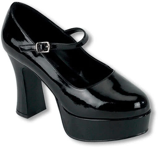 Die sexy High Heels haben einen Plateau Absatz von 12 cm und sind aus schwarz glänzendem Kunstleder gefertigt. Die schwarzen Mary Janes Pumps sind für Gothic und Lolita Outfits genauso geeignet wie für blutrünstige Vampierfrauen, sexy Hexen und verruchte Charaktere der Nacht.