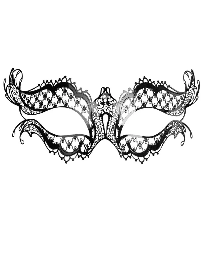 Die Augenmaske ist aus schwarzem Metall gefertigt und ähnelt in der Form einem Schmetterling. Die zarten Ranken und feinen Schnörkel umspielen locker das Gesicht. Ober- und unterhalb der Augen sind kleine weiße Strasssteine angebracht und oberhalb der Augen befindet sich ein größerer Strassstein in weiß. Die Maske wird mit schwarzen Satinbändern am Hinterkopf befestigt. Weitere filigrane Masken wie die Augenmaske aus Metall gold und die Metall-Augenmaske mit Strass und Federn schwarz findest du in unserem großen Sortiment.