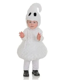 Das Geist Plüsch Kinderkostüm beinhaltet die Mütze mit Klettverschluss und ein Body mit Löchern für Arme und Beine und einem Klettverschluss am Rücken. Die Mütze hat oberhalb des Gesichtes zwei schwarze Augen und ein spitz zulaufendes Ende. Weitere süße Tierkostüme für Babys sind das Eisbär Plüsch-Kinderkostüm und das Teddy-Kuschelbär Baby Kinderkostüm.