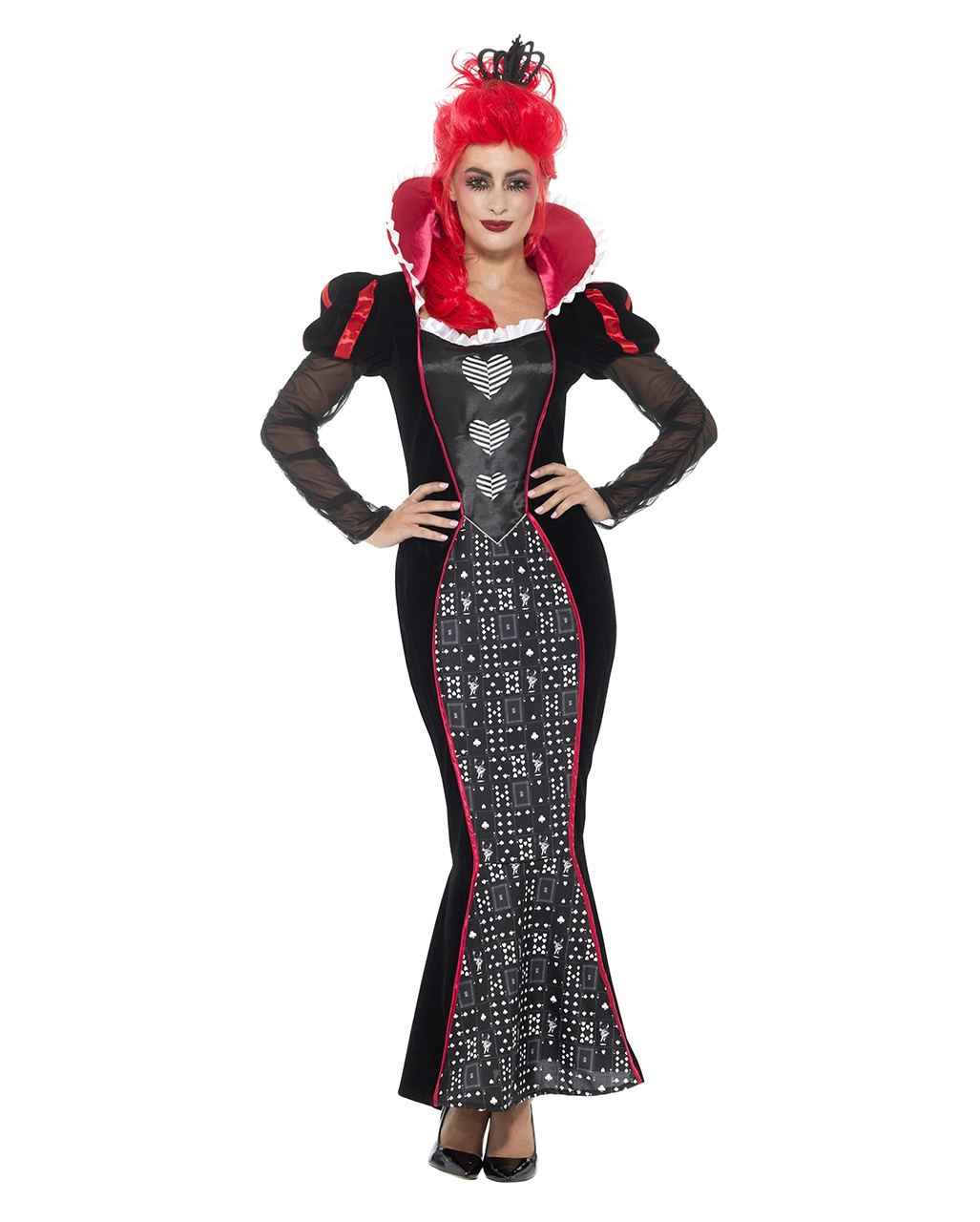 Das Queen of Hearts Kostüm besteht aus einem Königinnen Kleid mit transparenten langen Ärmeln, Und Herz Applikationen im Brustbereich sowie Puff-Ärmeln an der Schulter. Der Kopfschmuck ist in den Farben schwarz-rot gehalten. Trage zum Queen of Hearts Kostüm die Cosplay Langhaarperücke mit Locken rot und genieße den Applaus deines Volkes.