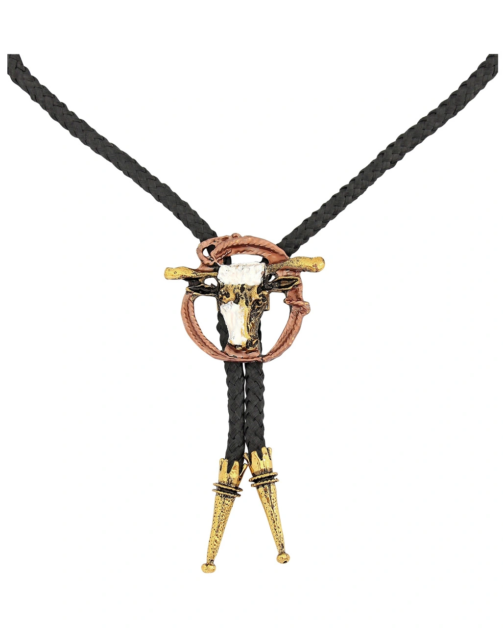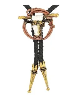 Die Schnürsenkel Krawatte für Cowboys besteht aus einer ca. 70 cm langen, schwarzen Schnur an der an beiden Enden goldfarbene Metallspitzen angebracht sind. Zusammengehalten werden die Schnurenden mit einer Brosche, auf der ein goldener Stier angebracht ist. Die Schnürsenkel Krawatte kann mithilfe der verschiebbaren Brosche enger gemacht werden. Die Krawatte ergänzt perfekt unser Western Hemd mit Stickerei und dem dazu passenden Cowboyhut schwarz.