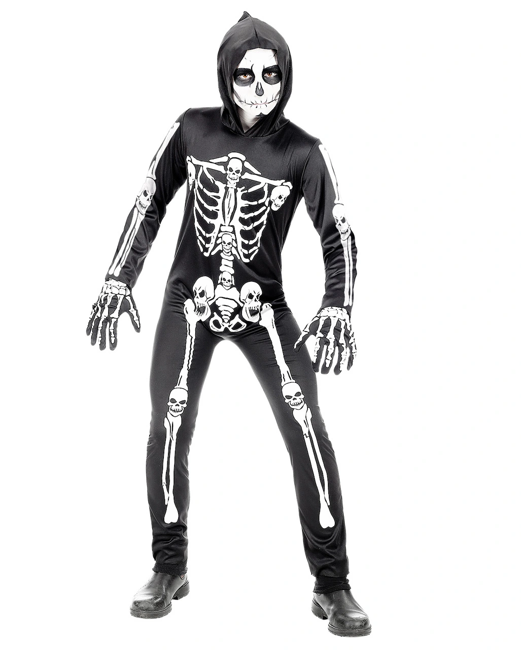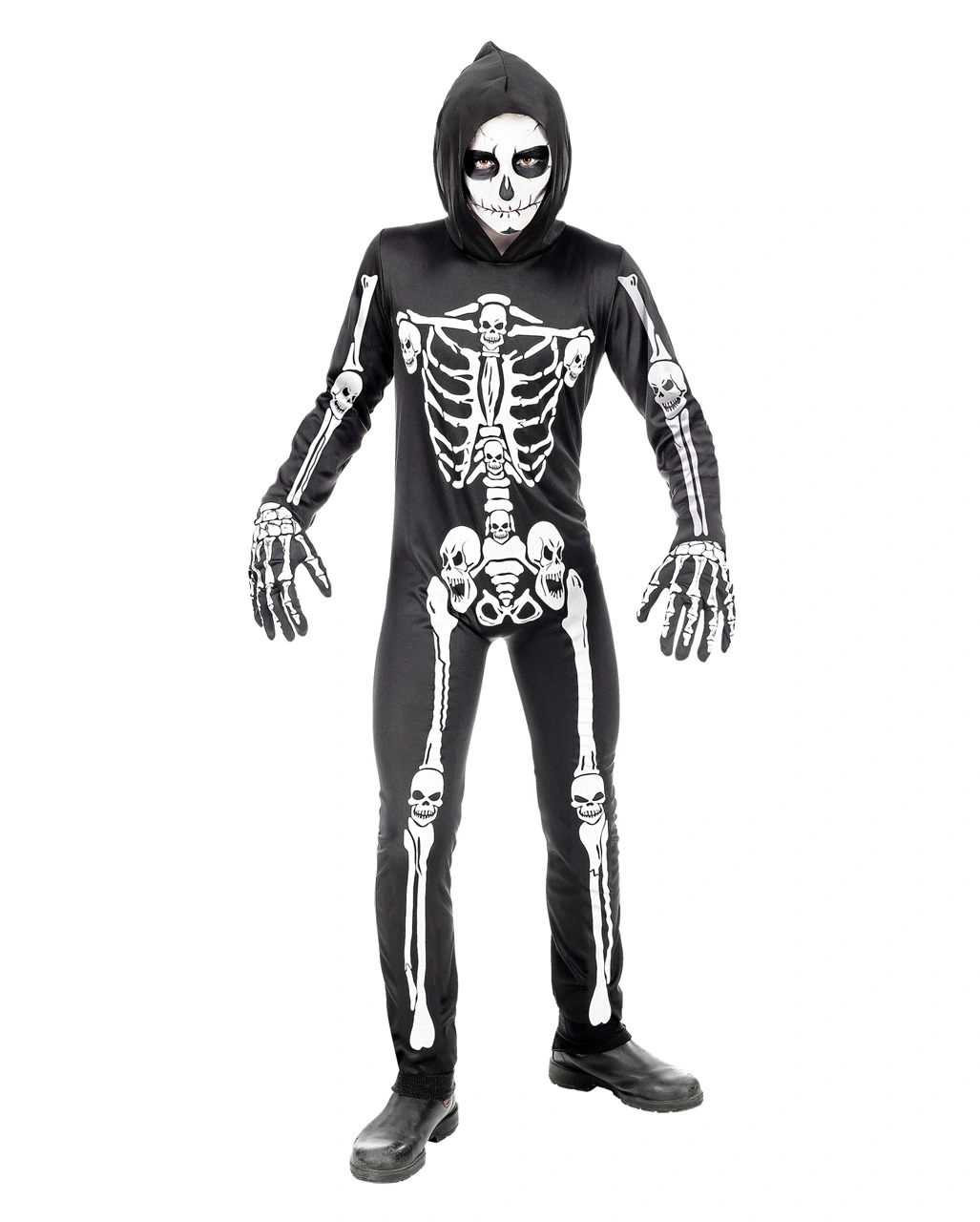 Das Skelett Overall Kinderkostüm ist das perfekte Halloween Kinder Kostüm. Unter dem Kinder Knochengerippe Kostüm kannst du eine warme Strumpfhose, Hose und einen dicken Pullover anziehen, damit deine Knochen nicht so klappern, wenn du in der Gruselnacht durch die Straßen ziehst. Der Skelett Overall mit Kapuze zeigt ein menschliches Knochengerippe und sorgt sowohl an Halloween als auch beim Kinderfasching für Gänsehaut. Passend zum Skelett Halloween Kostüm könnt ihr noch Family Skelett Make Up Set für das Gesicht kaufen.