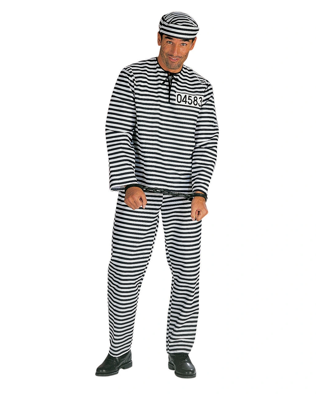 Das schwarz weiß gestreifte Gefangenenkostüm macht aus dir einen Vorzeige Häftling oder einen frisch enflohener Sträfling auf der Flucht vor der Justiz
