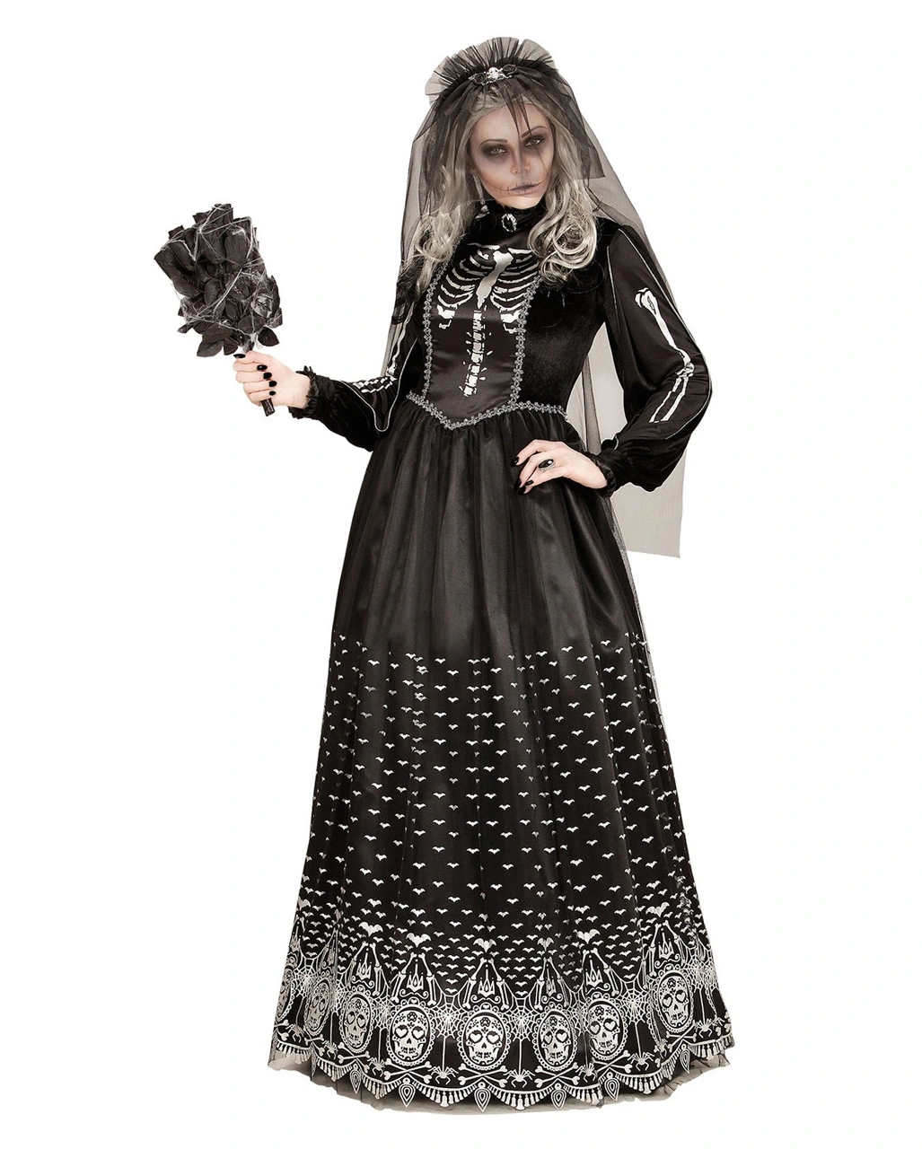 Das Tag der Toten Skelettbraut Kostüm ist ein schwarzes Gothic Kostüm, das in Größe S-L verfügbar ist. Es besteht aus einem Kostümkleid mit Reifrock sowie einem dunklen Brautschleier. Kleine silberne Totenschädel-Ornamente und winzige Fledermäuse bilden einen schönen Kontrast zum schwarzen Kleid. Im Brustbereich und auf den Ärmeln befindet sich ein Skelett-Print, der den Horror-Look verstärkt. Zu diesem Skelett Damen Kleid passt unser Tag der Toten Schmink Set und ein Schwarzer Rosenstrauß als Kostümzubehör.