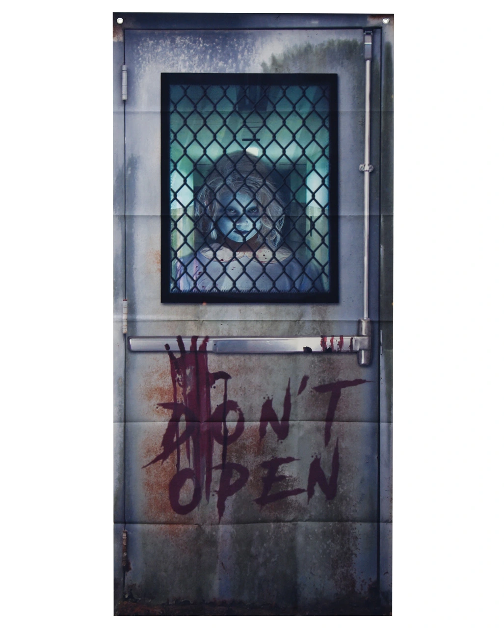 durch das Fenster herein sehen. Die Falsche-Tür mit Psycho Killer Motiv und blutigem Hinweis “Don`t Open” kann auf eine bereits vorhandene Türe gehängt werden oder du hängst die vermeintliche Tür an die Wand und erzeugst damit die Illusion von einem zusätzlichen Ausweg.