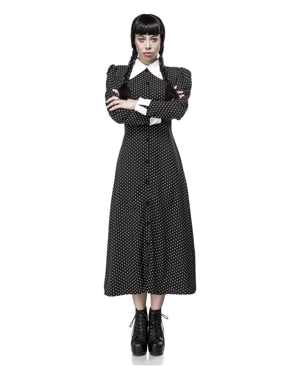 Wenn Wednesday Adams aus der Netflix Serie eine Schwester hätte, würde diese mit wahrscheinlicher Sicherheit Tuesday heißen und ihr vom Kleidungsstil sehr ähnlich sein. Tuesday liebt genauso wie Wednesday dunkle, lange Kleider mit Puffärmel und großem weißen Kragen. Um sich denoch ein wenig zu unterscheiden und nicht ganz so morbid und pessimistisch auszusehen, verfügt das Tuesday Damenkostüm aus luftigem Stoff über weiße Punkte und auf der Vorderseite über eine Zierknopfborte.
