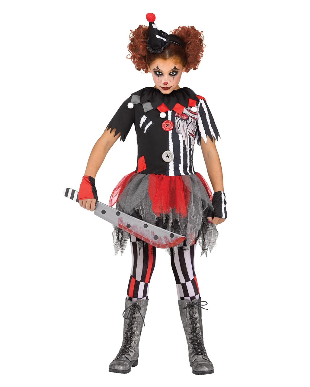 Das unheimlicher Zirkusclown Kinder Kostüm besteht aus Kleid, Kragen, Leggings, Haarreif sowie einem Paar fingerloser Handschuhe. Das Kleid der Faschings-Verkleidung für Kinder ist in der charakteristischen Harlekin-Optik gehalten mit versetzten, verschiedenfarbigen Streifen und Knöpfen sowie einem mit Rauten versehenen Kragen. Ein grauer, mit Fransen versehener Rock unterstreicht die finstere Optik deiner Psychoclown-Verkleidung. Ein Haarreif mit kleinem, neckischem Hut wird unkompliziert ins Haar gesteckt und vervollständigt zusammen mit gestreifter Leggings und farblich passenden, fingerlosen Handschuhen deine Horrorclown-Verkleidung. Dazu passen das Killer Clown Schminkset 9-tlg. und der Aufblasbarer Harley Quinn Hammer.