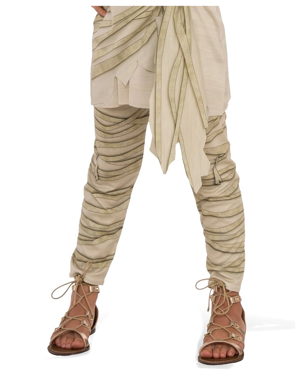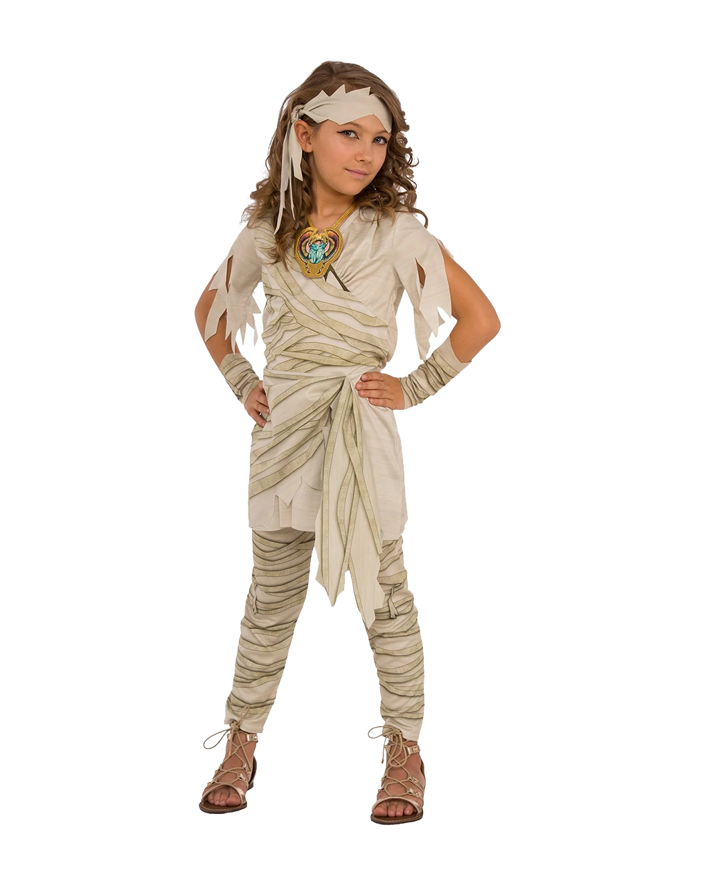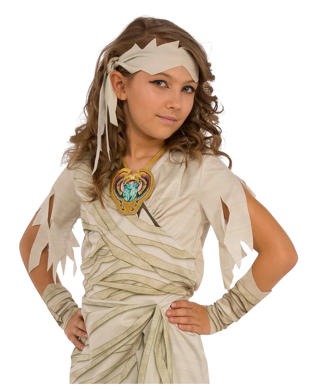 Erschrecke deine Eltern mit dem Untote Mumien Prinzessin Kinderkostüm. Das Oberteil und die Hose sehen aus, als würden sie aus beigefarbenen Mumienwickeln bestehen. Ganz stilecht trägst du auch die Armstulpen im Wickel-Stil. Das Kopfband komplettiert den untoten Wickel-Look des Halloween Damen Kostüms. Die wertvoll aussehende Kette allein zeugt davon, dass du eine echte ägyptische Prinzessin gewesen bist.