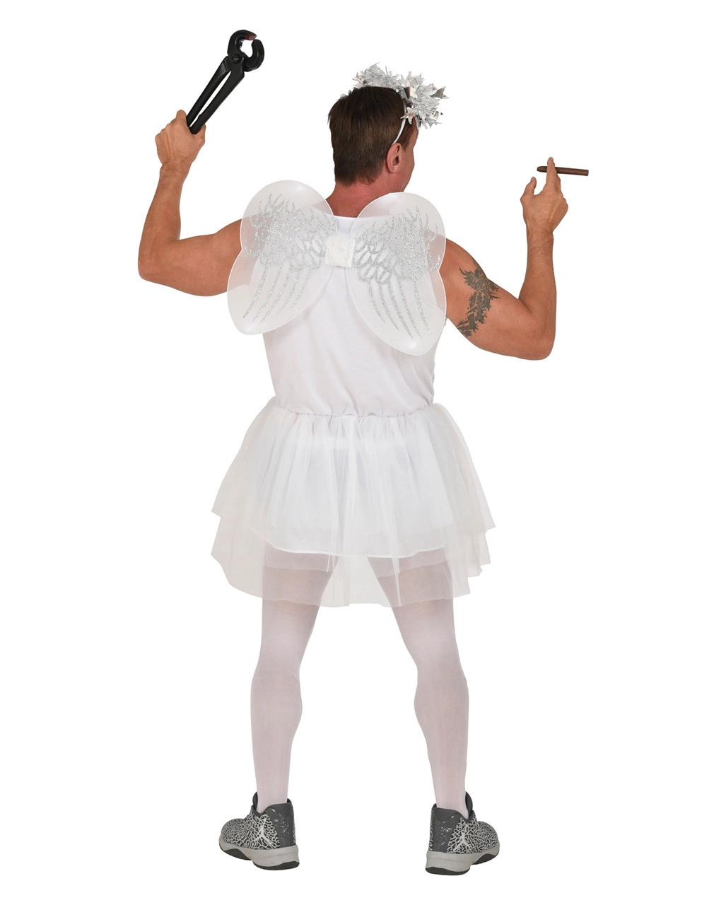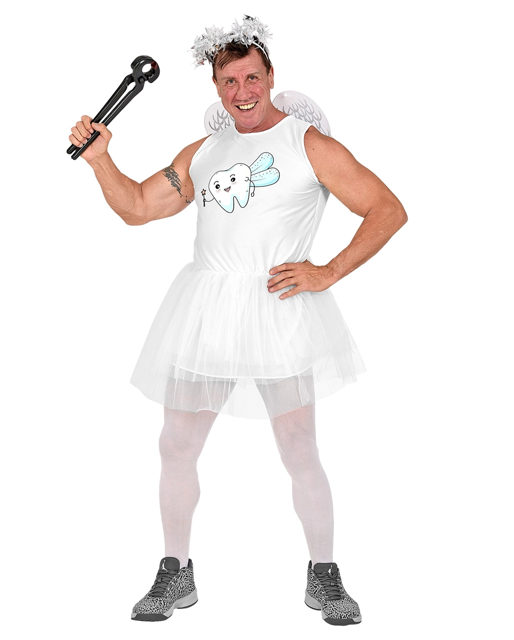 Das 3-teilige Zahnfee-Männerballett Kostüm besteht aus einem weißen Oberteil mit Zahnaufdruck an dem ein prächtiges Tutu angenäht ist, Zahnfee Kopfschmuck und weißen Flügeln. Passend dazu wäre noch ein Feen Zauberstab mit Silberstern. Für die Halloween-Variante findest du zudem die Folter Werkzeug Rohrzange, damit kannst du dann als folternde Zahnfee durch die Stadt ziehen.